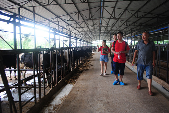最有特色的企业莫过于第一小组所前往林久农牧综合开发有限责任公司。该公司是以发展循环农业为主的综合农产品公司,主要产品有龙眼、有机蔬菜以及鲜牛奶。据董事长林久的介绍,林久牧业现拥有奶牛150头,其中许多已经怀孕,预计到明年这个数字将会增加到300。拥有有机桂圆100亩,有机蔬菜田若干亩。当队员们问到农场是如何实现循环时,林董回答道:“奶牛所产的粪便,是蔬菜和桂圆最好的肥料,而成熟的有机蔬菜,便是奶牛最好的饲料。”听了林董的回答,队员们都对这样的运营方式佩服不已。最值得一提的是,农场里的鲜牛奶,已达到欧盟标准,不仅为天友乳业提供奶源,还创办了自主品牌—牛丫头,是云阳片区唯一一家能喝到“巴氏牛奶”的牛奶品牌。不过据林董介绍,他的“巴氏牛奶”虽然独特,却不知名。因此希望借此次与重师大合作的机会,借助世界杯决赛