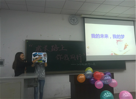 在会前进行了充分的讨论,为此次主题班会奠定了“反思.分享.在路上”中心思想,制定了播放“点滴记录”视频、分享入学一年的收获以及制作心愿海报三个“规定动作”。班会伊始,各班播放了精心制作的班级同学自入校以来录制的成长记录视频,之后,各班邀请在过去一年中在学业、个人成长等方面卓有建树的同学上台分享了自己大学一年的收获与体会,分享自己寻找人生目标的心路历程。2014级软件工程班的李姝雨同学,分享了自己暑假参加英语培训、学习吉他、参加暑期社会实践的种种体会,展示了自己一年以来获得的各种证书和奖状,她以实际行动告诉班级同学,不要在迷茫中止步,人生的方向需要在行动中寻找。活动最后一个环节是各位同学展示自己制作的心愿海报,用自己寻找的图片贴出一份属于自己的愿景海报,去探寻自己内心深处对于未来人生的希望和目标。