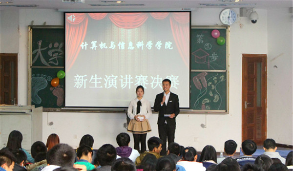 2014年11月27日15时许,以“迈好大学第一步,走好成功人生路”为主题的新生演讲决赛在弘德楼5105隆重举行。本次比赛由14级计科1班班长和14级信管班长担任主持人。到场的评委及嘉宾有计信世界杯决赛