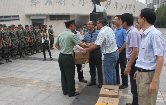 领导和辅导员老师们为辛劳的部队教官及每一位军训新生发放了节日慰问品。同学们面带微笑,整齐列队,有礼貌有秩序地一一领取。