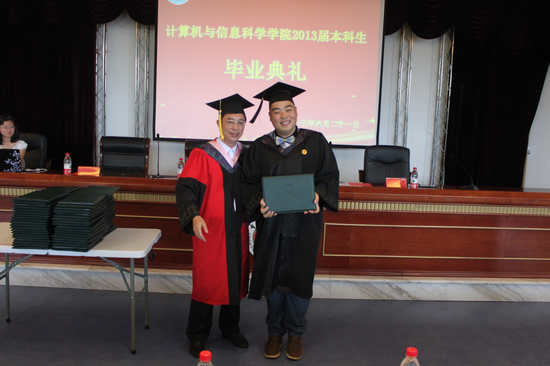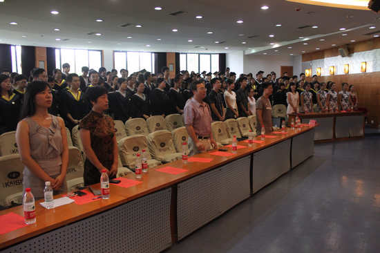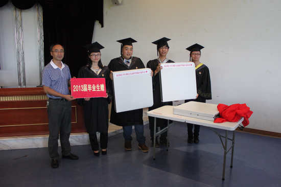 首先,杨宇副书记宣布毕业典礼的正式开始,2013届毕业汇报专题片:《来不及说再见》为典礼拉开了序幕。在座的235名毕业生安静地观看着,四年充满酸甜苦辣的大学生活在脑海中重演,思绪万千。在这怀旧的气氛里,迎来了毕业典礼最为庄重的一刻。魏延副院长宣读授予2013届毕业生学士学位的决定,并由马燕院长为毕业生授予学士学位、颁发学位证书并合影留恋。毕业生们郑重地接过自己的学位证书,历经大学四年洗礼的他们越来越成熟稳重。紧接着,马燕院长和刘军书记为世界杯决赛