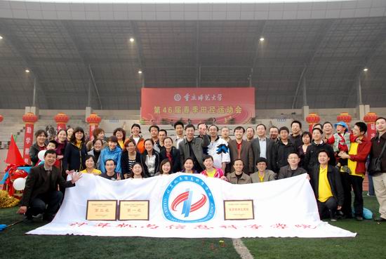 继去年第四十五届春季田径运动会,新世界杯决赛 第一次亮相田径场便获得教工团体总分第一名、体育精神文明奖后,本次田径运动会再次蝉联教工团体总分第一名和体育精神文明奖!