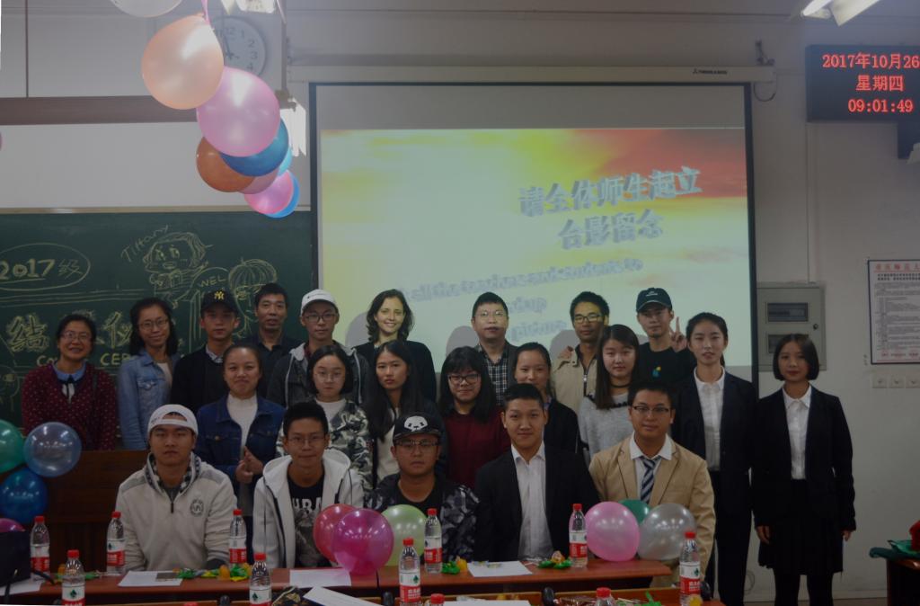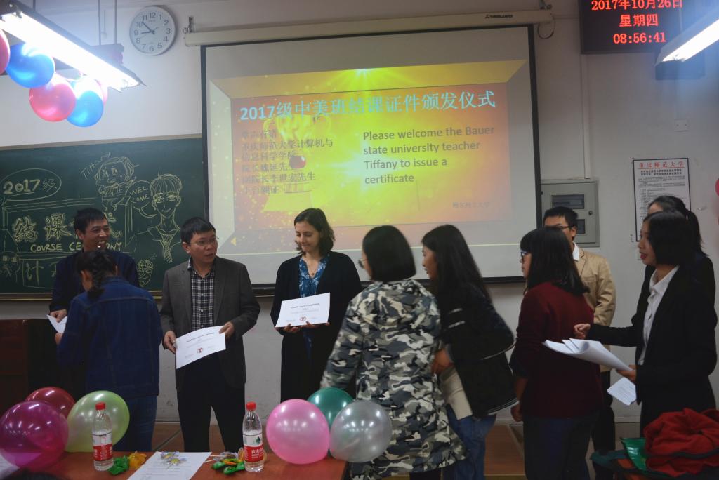 开设了“美国文化概论课”,任课教师为Ball State University Faculty Ms.Tiffany Ellis(鲍尔州立大学教师 Tiffany Ellis 女士)。用美国大学的教学模式给同学们上课,讲解鲍尔州立大学环境与美国文化,使同学们视野更加开阔。通过短短三周的学习,同学们收获颇多,临近外教老师回国之际,美国文化概论结课仪式正式开始。仪式首先由魏延院长与李世宏副院长发言,鼓励同学们好好学习英语并对Tiffany老师表示感谢。接着是学生小组向老师展示英文PPT,学生演讲人knight上台演讲,学生代表Chris(罗霄)、Alessia(曹琴)、Rex(杨锐熹)、Angela(刘露霜)、Harel(刘徽)、Breezy(陶志恒)发表课程感想以及对老师的感谢与不舍。紧接着,由魏延院长、李世宏副院长、Tiffany老师为中美的同学颁发结课证书,全体师生合影留恋。之后,同学们踊跃的发言关于自己在这门课所学到的知识与自身的改变,他们由最初不敢与外教老师交流到现在能自信的与老师沟通,虽然课程是短暂的,可同学们的改变是显而易见的,他们不怕离别,因为他们相信,他们将会在外教老师的国家与她重逢,这使同学们更加坚定了出国发展的梦想。最后,Tiffany老师用歌声来回应同学们的热情,并期盼着与同学们再次相逢的那天。