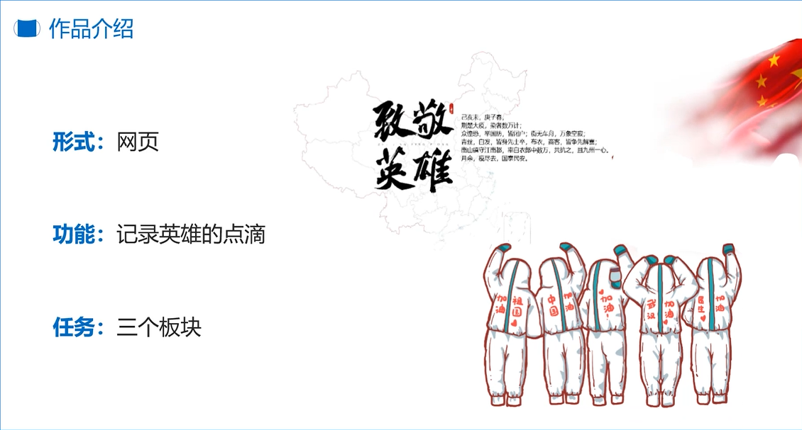 同学们在制作项目搜集国家大事记和先进人物素材的过程中,纷纷感受到在这次疫情中每个人都扮演了不同的角色,有救死扶伤的白衣天使、有冲锋陷阵的铁血军人、有逆流而上的快递小哥、有无私奉献的志愿者们,他们默默扛起了责任,为我们负重前行,作为学生该做的就是努力学习,用知识回报社会,用作品记录他们的英雄事迹。通过这个项目,学生们感受到了中国人民团结精神、国家之昌盛,感受到了社会主义制度的优越性,学生的爱国情怀与责任感与日俱增,决心在实现中华民族伟大复兴的中国梦中实现自己的价值。