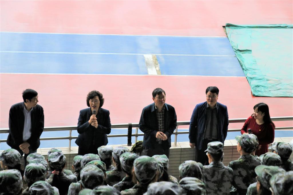 党委书记陈兰、院长魏延、党委副书记何东、副院长李世宏、团委书记钟华与新生指导员刘宇、梁耀文、项铸为认真训练的新生们送去温暖慰问。