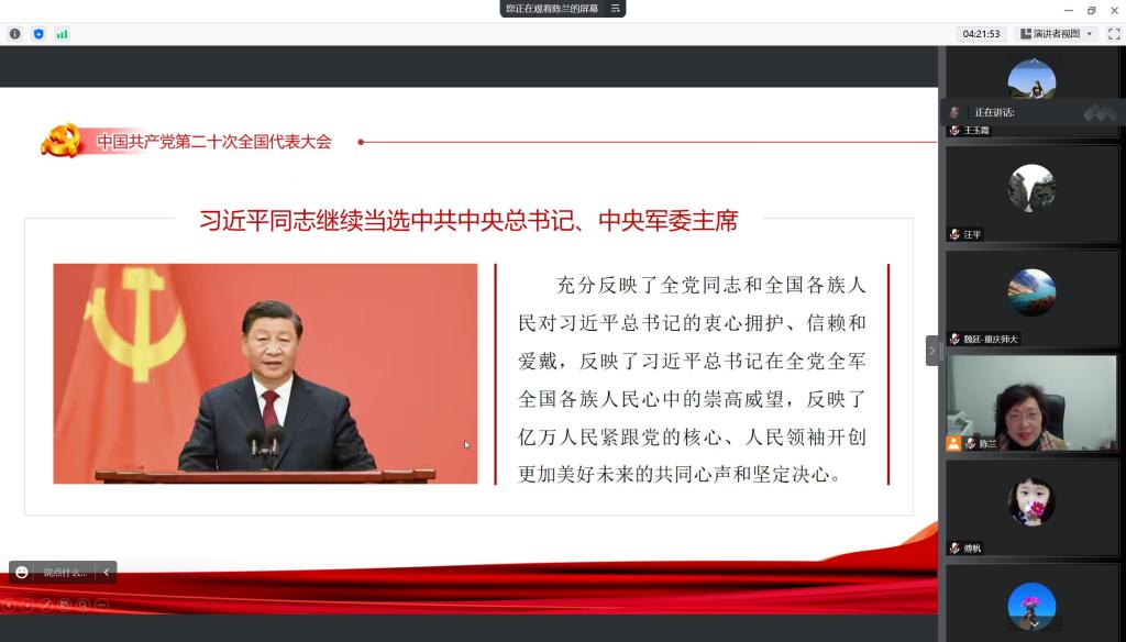 党委书记陈兰以“深入学习贯彻党的二十大精神,增强全面建成社会主义现代化强国的信心”为题,向全体教职工讲授党课,本次党课采用线上形式进行。
