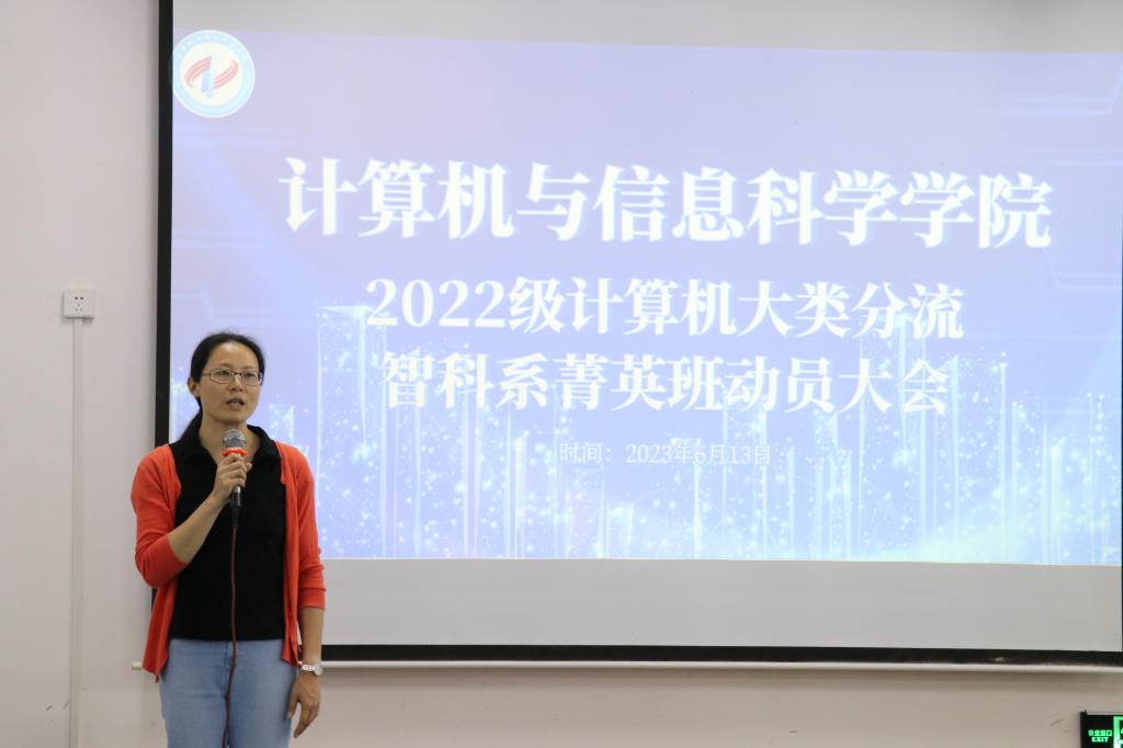 在砺志楼2412举行2022级计算机类专业分流菁英班动员大会。智能科学与技术系系主任朱德利,智能科学与技术专业导师代表兰晓红、吕佳, 21级智科系菁英班优秀学生代表蓝小云,2022级计算机类全体学生参与本次会议,辅导员胡绍宇主持会议。