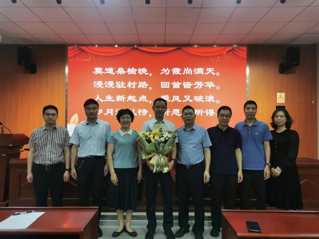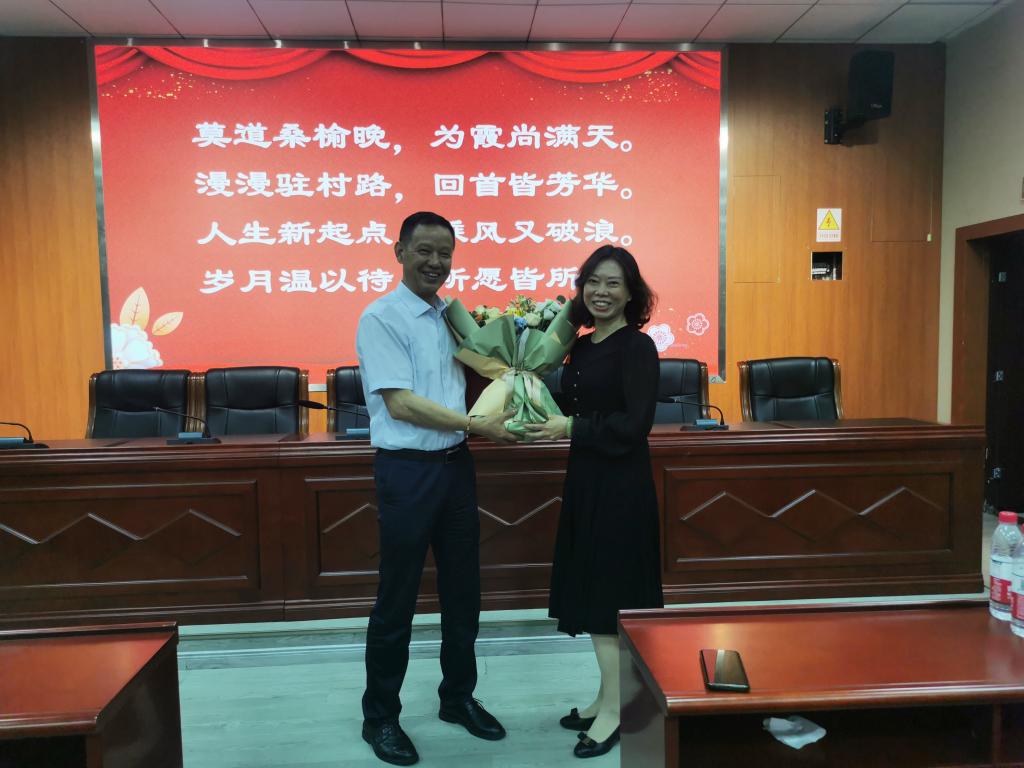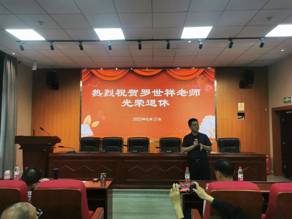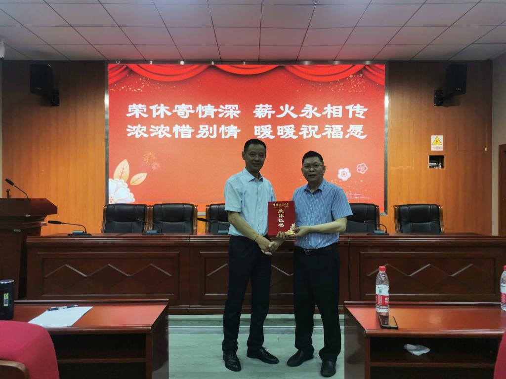 工会教代会主席李晓虹代表全院师生献上鲜花,魏延为罗世祥老师颁发荣休证书及荣休纪念品,表达了感激之情和美好祝愿,同时也提出请罗老师今后持续关心关注世界杯决赛