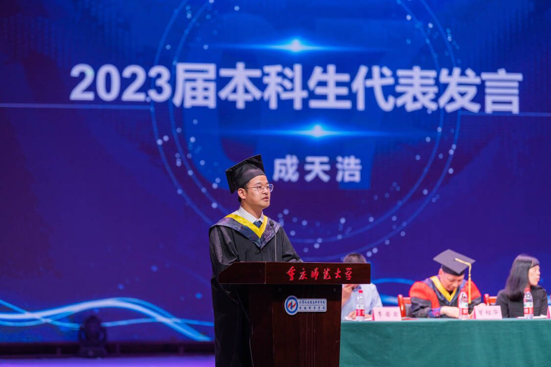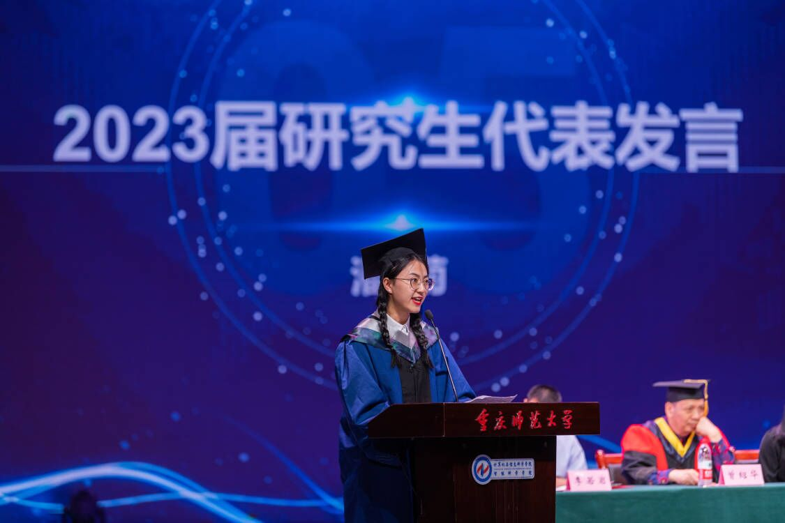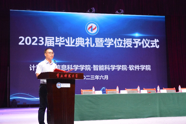 2023届研究生代表潘菊同学进行发言,她表示同学们应与时代同频共振,在挑战中塑造理想信仰,在奋斗中共筑计信精神,书写了新时代青年勇挑重担的青春诗篇。2023届本科生代表成天浩同学鼓励计信学子们在新时代改革开放的广阔天地中勇敢绽放,一定会在各行各业发光发热。教师代表罗凌老师将“祝贺”、“爱护”、“期待”三个词送以全体毕业生表达了美好期盼和良好祝愿。