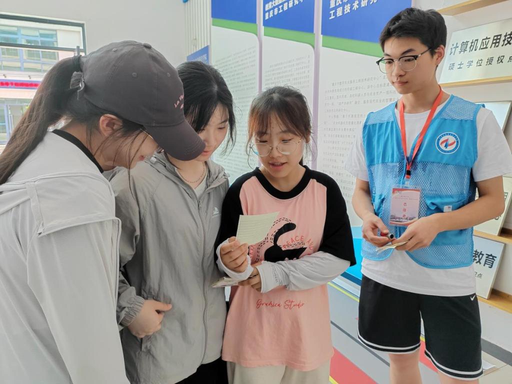 楼开展的“致用代码大挑战”,通过队员之间的默契配合,经过多次讨论与尝试,成功破译代码之谜,锻炼了同学们的编程素养、逻辑思维能力和团队协作能力。在知行楼开展的“趾行决”游戏则是一场充满智慧与体力的比拼,三名同学与志愿者进行脚上的石头剪刀布对决,不仅考验了他们的反应速度,也展现了团队合作的精神。泛月桥上的“月桥诗词会”更是一场文化的盛宴,同学们需在志愿者的引导下分别背诵两种不同题材的古诗词并不可重复,这对工科学生来说是一大挑战,但在通关过程中同学们充分彰显了自己的文学素养和记忆力,传统古典文化的韵律和意境,在泛月桥的映衬下显得格外动人。最后,同学们来到了芳华坪开展“魔方之韵”挑战,四人小组需分别还原四个打乱的魔方,这不仅是对个人能力的考验,更是对团队协作精神的挑战。最后,在计信世界杯决赛
