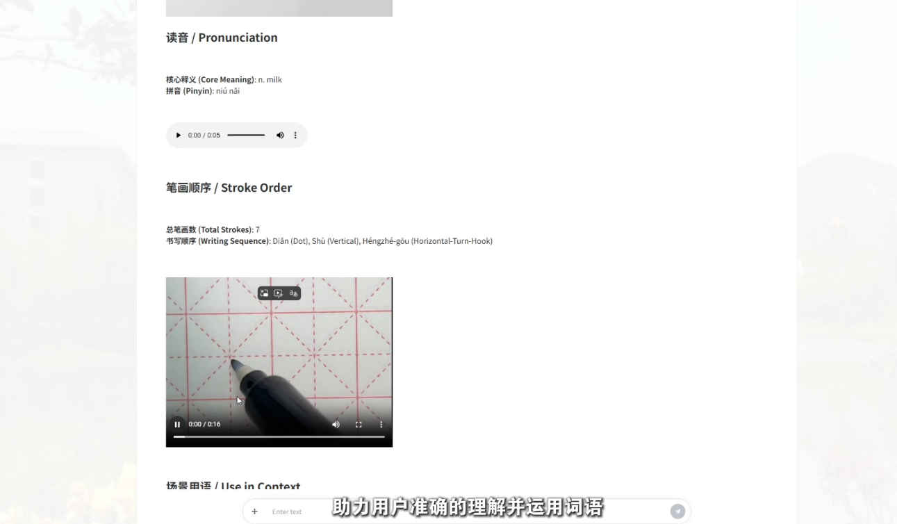 “师道汉韵”正在逐步成长为全球中文学习者最贴心的智能助手,支持多语种(包括英语、僧伽罗语、卢旺达语等小语种)直接交互。能够精准响应学习者用母语发起的查询,快速提供目标汉字或词语的完整学习包:中外文对照释义、配图辅助理解、标准拼音与可点播的清晰发音、动态笔顺书写视频、来自教材与真实生活的场景例句,帮助学习者在碎片化时间里高效完成从“认读—发音—书写—应用”的闭环掌握,真正做到让每一位海外学习者都能随时随地、随问随学。