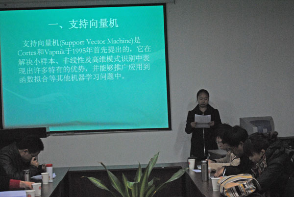 随后,精彩的演讲开始。吴瑕同学就“支持向量机多类分类研究与应用”展开了自己的演讲。她就基于FSVM和决策树的文本分类器详细的阐述了自己的见解;赵漫同学的演讲题目为“基于复杂网络理论的交通网络的研究”,选题具有十分重要的应用价值;韩建超同学针对自己的研究领域做了一个有关“数据挖掘在智能电网中的应用”方面的演讲,他从智能电网的概念到研究意义,从数据分析到应用领域娓娓道来;邬啸同学就“模糊支持向量机隶属度的确定方法”深入分析比较了几种隶属度的确定方法;尹丽花的研究题目为“SIFT特征匹配算法研究”,将SIFT特征匹配算法由浅入深地进行了讲解。他们的演讲内容充实,语言表达清晰流畅。制作的PPT图文并茂,讲解详略有度,激情飞扬。
