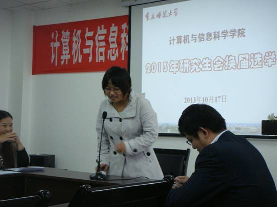 研究生秘书李明勇老师以及11、12和13级研究生出席了此次大会,大会由研究生会文娱和体育部部长陈美莲主持。