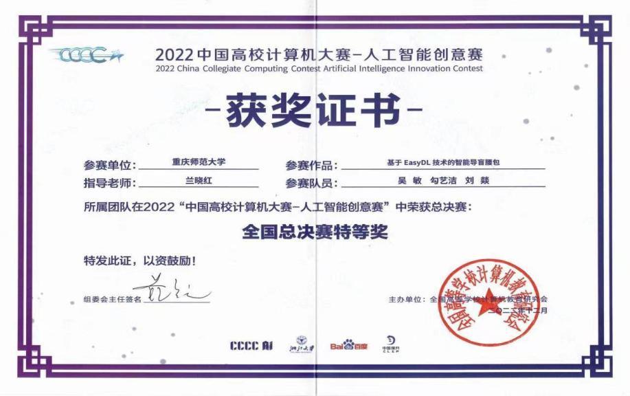 在2022年中国高校计算机大赛-人工智能创意赛中,由兰晓红老师指导,吴敏、勾艺洁、刘燚创作的《 基于EasyDL技术的智能导盲腰包》项目,荣获全国总决赛特等奖。