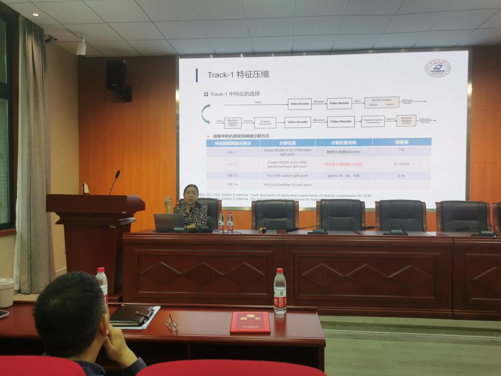 随后,喻教授首先基于自动驾驶、智慧城市、工业互联网等场景中的视频分析,对面向机器视觉的图像视频编码的研究背景进行阐释,指出面向人类的视频与面向机器的视频在应用场景、信息处理、编码和信息处理与使用上存在着差异。紧接着,她从VCM标准发展现状,Track-1特征压缩、Track-2 先压缩后分析的两条技术路线,以及MPEG143次会议中VCM最新进展等进行了详细介绍。她谈到,机器视觉编码是研究以智能应用为目标的压缩编码技术,在保障压缩率的同时,要做到计算机视觉任务的无损。提取到的压缩视频或特征码流可服务于多种机器任务,同时保障高压缩效率和机器智能任务性能。同时指出,三个核心任务(目标检测/实例分割/目标追踪)加两个主要评估数据集(OpenImageV6/TVD)。就两条思路中两条标准里所提到的VCM架构,一个是根据特征来统计的压缩方法,另一个是将特征转换成图像,然后再进行图像压缩编码。对于特征压缩,一方面是现有的编解码方案,可以把它变成HEVC、VVC等。另一方面是新的技术方案,包括有特征变换,就是对统计特性进行视频域的分布的变换。对此,喻教授进行了详细的介绍。最后,喻教授向我们指明了面向机器视觉图像视频编码技术未来的努力方向。
