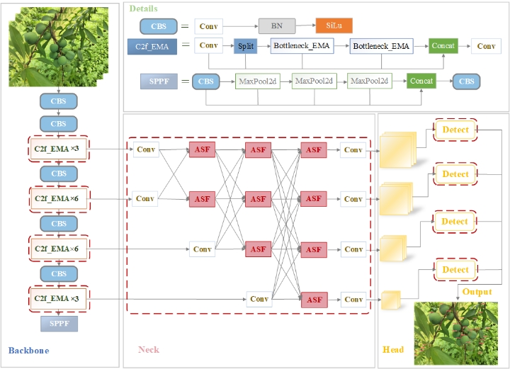 准确检测青脆李对于实现智能化采摘、精确产量预测、智能疏果等一系列果园自动化管理技术至关重要。然而,在真实复杂的果园环境中,由于青脆李的尺寸较小,果皮和背景颜色相似并且果实之间重叠遮挡,导致青脆李检测仍然面领着巨大的挑战。为应对上述挑战,本文以YOLOv8s-p2为基础网络,设计了一种适用于真实果园场景下青脆李检测的MAE-YOLOv8模型。该模型集成了高效多尺度注意力模块,强化了对目标与背景的区分;同时,通过渐进式特征金字塔网络优化了特征融合过程,增强了对小目标特征的识别能力;此外,引入了MPDIoU损失函数,有效解决了果实重叠和遮挡导致的漏检问题,从而提升了模型的精度和收敛速度。在实验部分,使用自建的青脆李数据集对模型性能进行了评估,并综合比较了不同模型的精度、召回率、检测速度。结果显示,所提出模型在各项指标上均优于其他检测模型,并展现出较强的鲁棒性,为青脆李智能化采摘、估产、疏果等设备的研发提供了技术支撑。