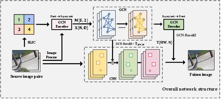 在多聚焦图像融合领域中,现存网络往往需要复杂的模块设计和庞大的参数量才能取得良好的融合效果,这对许多计算资源受限的轻量化设备并不友好。为此,论文提出了一种分块切割与像素优化结合的巧妙思路。具体来说,文章首先利用图卷积神经网络对超像素聚类形成的大尺度不规则区域进行柔性卷积,取得块级粗分割。接着采用并行轻量化卷积神经网络进行像素级指导,最终取得了更高质量的融合图像。此外,为实现两种网络优势互补,使得欧几里得面向数据能与非欧几里得导向数据对齐与融合,论文精心设计了一种基于超像素的图解码器和一种基于像素的CNN基础提取块实现特征获取与传播,并在多个数据集上取得了state-of-the-art(SOTA)效果。