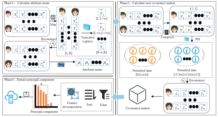 主成分分析(PCA)作为数据挖掘领域的关键技术,面临隐私泄露风险等现实挑战。尽管本地差分隐私(Local Differential Privacy, LDP)能够通过保护个体数据隐私实现全局统计分析,但其在PCA任务中的应用仍存在精度瓶颈。为此,本文提出基于本地差分隐私的主成分分析方法(LDP-PPA),旨在实现隐私保护与主成分提取准确性的双重提升。LDP-PPA解决了两个核心挑战:异质属性均值计算与噪声干扰下的协方差矩阵构建。针对前者,由于传统LDP机制对异质属性添加同等级噪声会导致精度损失,LDP-PPA提出同质空间映射策略:先将异构数据映射至标准化空间,再结合截断拉普拉斯机制进行扰动,从而降低异质性对噪声敏感度的影响。针对后者,LDP噪声易破坏数据相关性特征,为此LDP-PPA设计了功能性区间划分机制,通过提升高功能性区间扰动概率,有效维持协方差矩阵的统计特性。此外,本文从理论层面证明LDP-PPA满足严格的ε-本地差分隐私,并在三个公开数据集上验证其性能。实验表明LDP-PCA在主成分提取准确性以及隐私-功能权衡方面较现有方法具有显著的优势。