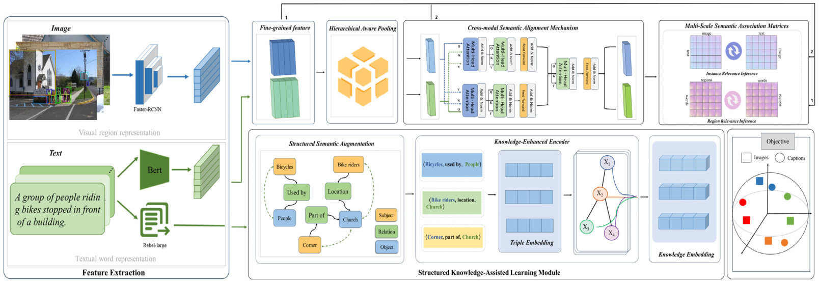 该研究针对图像-文本匹配任务中冗长文本描述导致的语义模糊及跨模态语义对齐等关键挑战,提出了一种多模式结构知识增强的视觉语义自适应嵌入方法(PASE)。首先,通过构建结构化关系图显式表征文本核心语义并注入文本嵌入中,有效挖掘文本中的高阶语义关联;其次,设计了广义池化算子进行嵌入聚合,在捕获宏观语义的同时可自适应增强代表性区域或词语的特征表达;进一步引入多粒度匹配机制,融合全局与局部对齐信息,显著提升了图文匹配的准确性。实验表明,该方法在多个数据集上均达到了领先水平,展现了良好的性能优势。
