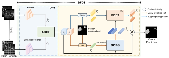 针对少样本医学图像分割中特征分布差异导致的类内差异,以及复杂背景引发的极端类间不平衡这两大核心挑战 ,论文提出了一种创新的双流原型优化框架(DFDT)。该研究首先构建了双流视觉特征融合模块(DVFF),将CNN提取的细粒度局部特征与Swin Transformer捕获的全局依赖并行融合,生成语义丰富的交互特征以降低类内差异。随后引入原型细节增强Transformer(PDET),通过多轮迭代的偏差校正与细节细化,系统性滤除复杂背景噪声并强化目标前景的核心信息。该方法成功将异构特征提取与Transformer深度优化相结合,为数据稀缺场景构建了一个极具潜力的高精度医学图像分割智能框架。