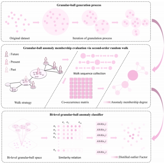多粒度认知计算科研团队的负责人桑彬彬副教授作为通讯作者,研究生张华作为第一作者,于计算机与人工智能领域国际顶级期刊《IEEE TRANSACTIONS ON FUZZY SYSTEMS》(中科院一区TOP期刊,影响因子11.9)发表了题为“Second-Order Biased Random Walk Outlier Detection Based on Bi-Level Granular-Ball Knowledge Representation”的学术论文。