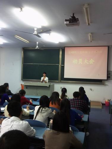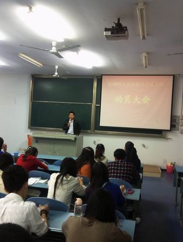 下午16:10,大会准时开始。首先,张老师向大家传达了动员大会的会议精神,号召在座的入党积极分子们珍惜并把握这次机会,争取早日入党。随后,第48期党校培训大组长胡静思上台,将党课的课程安排、时间地点及各年级相关负责人做了详细告知。最后,张敬老师进一步对即将参加党课培训的同学们提出了几点要求:1、提前十五分钟到达相应教室完成签到工作;2、着装整洁,不得迟到、旷课、早退、代课;3、培训结束后写2000字的思想汇报交年级负责人处。至此,大会圆满结束。