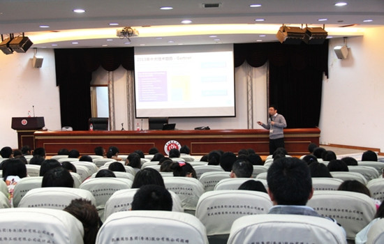 、个人和成长四者之间的关系,并提出同学们应为未来的挑战而做的三个准备,即“了解当前的环境”、“知晓未来的趋势”、“善于思考、勤于练习”。紧接着,汪维先生又用简单易懂的语言解释了“大数据”、“云计算”、以及新名词“移动互联”三大IT用语,为同学们拓宽了在IT行业的视野。汪维先生用生动形象的话语为同学们逐渐深入讲解,内容涉及终端层发展史到移动生态系统,安卓系统与苹果系统的对比等。最后,讲座在同学们与汪维先生的热情互动中圆满结束。