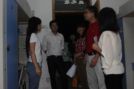 辅导员老师、团总支学生会主席团成员不辞辛苦,走访了和风苑、嘉风苑、惠风苑新生寝室。与新生及家长亲切交谈,对其一天的辛苦表示慰问,针对新生的各类问题一一进行解答,并提醒新生军训的注意事项。从他们的激动的言表中可以看出,我们大一辅导员“朱姐姐”挺受欢迎的。
