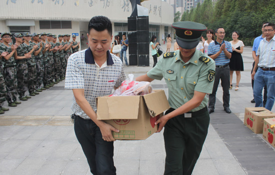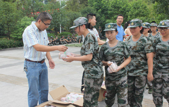 领导和辅导员老师们为辛劳的部队教官及每一位军训新生发放了节日慰问品。同学们面带微笑,整齐列队,有礼貌有秩序地一一领取。