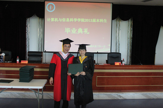 首先,杨宇副书记宣布毕业典礼的正式开始,2013届毕业汇报专题片:《来不及说再见》为典礼拉开了序幕。在座的200余名毕业生安静地观看着,充满酸甜苦辣的四年大学生活在脑海中重演,思绪万千。在这怀旧的气氛里,迎来了毕业典礼最为庄重的一刻。魏延副院长宣读授予2013届毕业生学士学位的决定,并由马燕院长为毕业生授予学士学位、颁发学位证书并合影留恋。毕业生们郑重地接过自己的学位证书,历经大学四年洗礼的他们越来越成熟稳重。紧接着,马燕院长和刘军书记为世界杯决赛