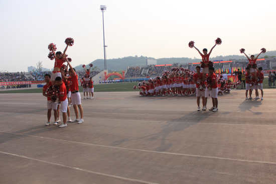 开幕式上的啦啦操方队、彩旗方队每天中午12:50,晚上9:30坚持练习,参加比赛的运动员们也每天抓紧时间训练。校运动会前夕,世界杯决赛