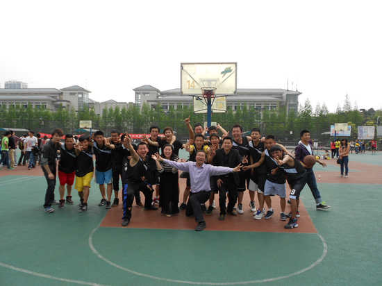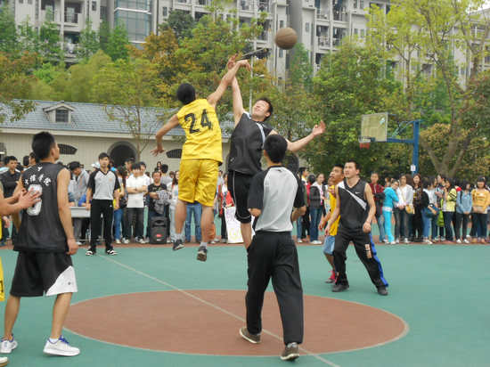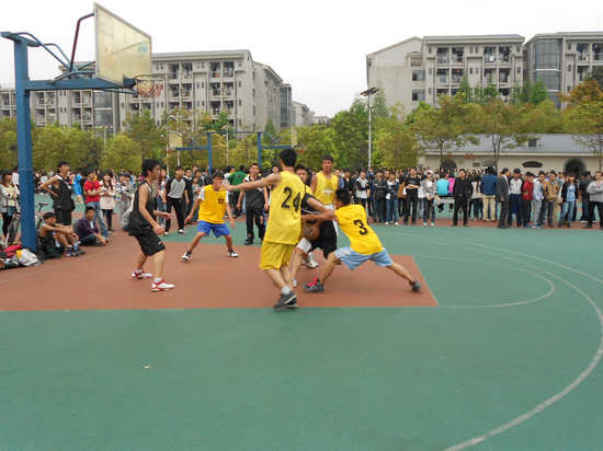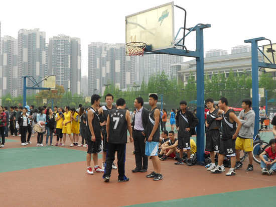 杨宇老师亲自上场与队员们亲切交流,并玩起了趣味投球赛,意在放松大家的心情,更是为了鼓舞。孙柳燕老师也早早地到达女生场地,加油鼓劲。比赛开始,场上气氛迅速升温,各专业的啦啦队热情洋溢,活力四射,呐喊声如球员们的强心剂,他们呐喊着洪亮的口号,为自己的球员们加油。随着裁判的哨声响起,我方男子队的球员们鼓足全劲投入比赛,进攻时拼劲十足,防守时紧紧跟上,没有丝毫懈怠。两方队员势均力敌,彼此不分上下。只见着健儿们不停地拦截、夺取、传递、投篮,一环接一环,毫不松懈。场边的观众们不停地加油较好,掌声一片。而在下半场,世界杯决赛