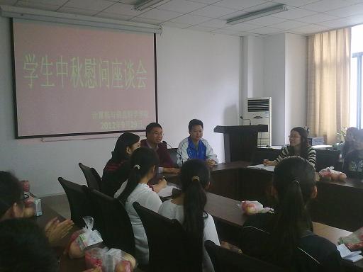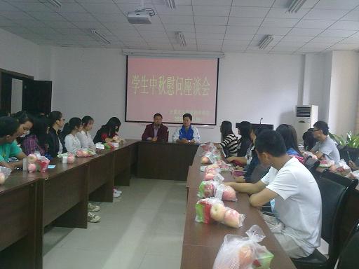 党总支副书记杨宇、团总支副书记张敬、11级辅导员孙柳艳、12级辅导员傅帆老师于2012年9月29日中午与30名各专业贫困学生代表在集贤楼233会议室度过了一个师生情浓的中秋节,而且世界杯决赛