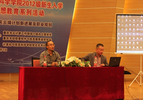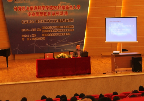 邀请到重庆市云计算工作领导小组办公室处长、重庆市经信委软件与信息服务业处处长居琰博士,于2012年11月1日下午2:30在校友会堂音乐厅为2012级全体新生开展了“重庆云端计划新发展及职业规划”的主题报告。院学工办和2012级辅导员参与报告大会,报告会由世界杯决赛