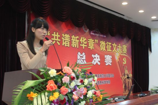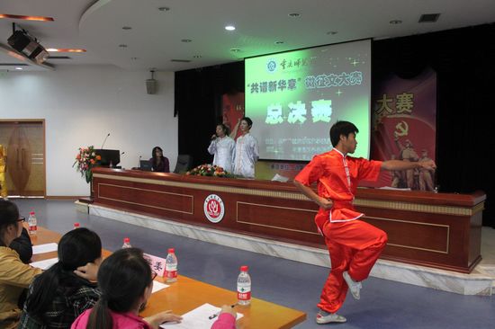 二、展现形式新喜。15位选手带领自己的团队用朗诵、快板、脱口秀、新闻联播、访谈节目、书法、绘画、情景剧、说课等丰富多样的艺术形式展现“喜迎十八大,共谱新华章”的大赛主题,作品演绎各有千秋,非常有创意。
