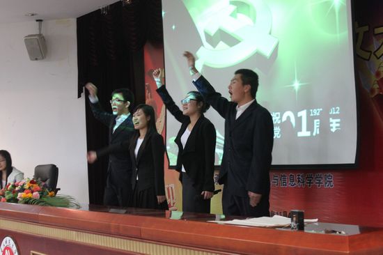 的沈盼同学带领团队用娴熟的配乐演讲与歌唱技巧深刻诠释了其微征文作品——“在党的光辉照耀下,新中国走过的光辉之路”,夺得一等奖;计信世界杯决赛
