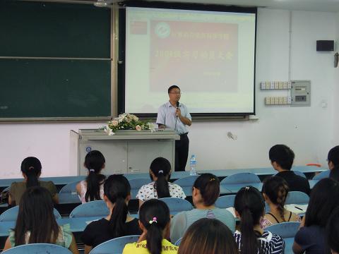 2009级全体学子济济一堂,参加会议的领导有:副院长李世宏、党总支副书记杨宇,此次大会由09级辅导员朱嘉洁老师主持。