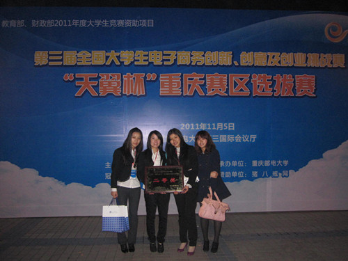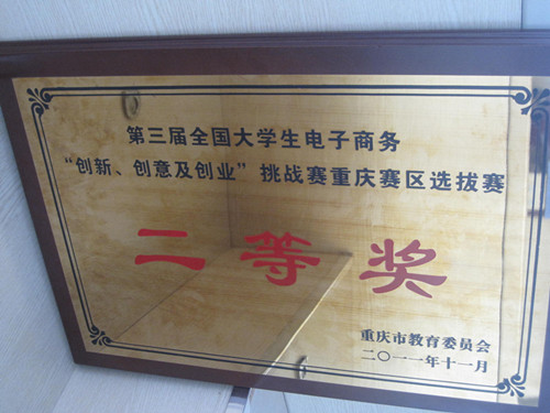 电子商务专业教学指导委员会主办、西南财经大学承办的第三届全国电子商务“创新、创意及创业”挑战赛(“三创赛”),并在2011年11月5日于分赛区主办方——重庆邮电大学喜获“三创赛”重庆赛区选拔赛二等奖的佳绩。