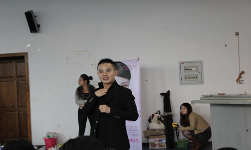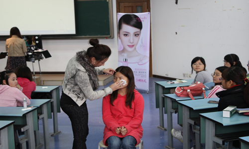 众多女生闻讯而来,准备上一堂别开生面的化妆课。讲座上,盛涛老师首先为现场同学简单讲解了脸部清洁和护理方法,并与大家进行了活跃的互动。为了使大家对化妆有一个更为形象的理解,盛涛老师盛涛老师以及他的专业团队现场选择了三位脸型,面容较为典型的女生进行化妆演示。上妆过程中,同学们紧随老师的手到之处,发出阵阵轻叹声。本次讲座动在女生中引起了较大的反响,都纷纷表示学到很多实用的技巧。