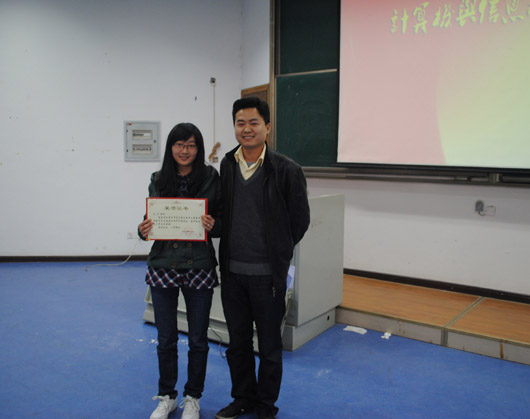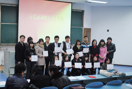 下午4:00,在一片热烈的掌声中大会正式拉开帷幕。首先,精彩的PPT播放激奋人心,让大家感受到作为计信人特有的骄傲。最期盼也最令人激动的颁奖环节紧随其后,张敬老师公布获奖名单后,老师们在激昂的乐曲声中为获奖者一一颁发荣誉证书。大会最后,张敬老师发表讲话,对2010年的工作进行了简要而中肯的总结:“苦”和“荣”并存。同时,他对2011年作出了展望与规划,并着重介绍了目前正在建设中的涵盖了计信e家人、学生动态信息管理以及静态信息管理三个部分的“学生管理系统”,旨在两年内形成计信世界杯决赛