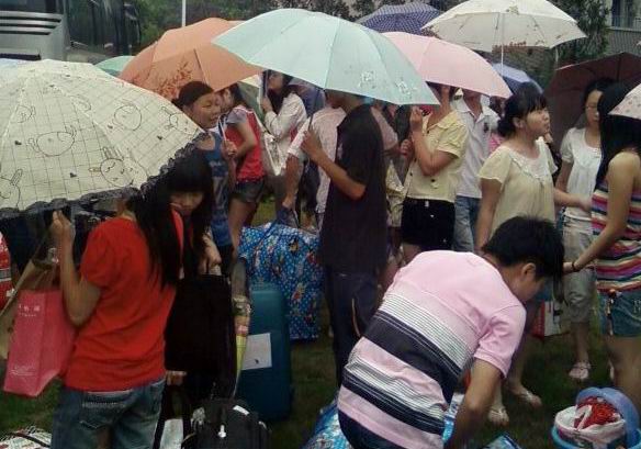 同学们在暴雨中有序的搬迁