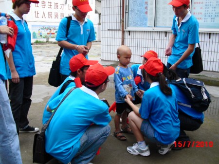 的十二名“三下乡”服务团队成员在捐款箱前排成长长的队伍,奉献着自己的一份爱心。捐助活动中,我们看到曾经无助的胡开生抱着身患重病的儿子,眼神中透露出希望的曙光,并不停地向走向捐款箱的热心捐助者鞠躬表示感谢,而且口中还不停的说着祝好心人一生平安的话语。捐款结束后,同学们抱着胡志佳鼓励他一定要坚强,同时祝福他早日康复,能像正常小朋友一样有一个快乐的童年。