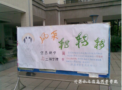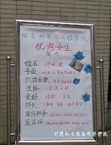 07级的两名女生邓晓霞和李海燕以她们优异的成绩和先进的个人事迹引来了过往女生的参观和称赞。“风采转转转”是为了增强各院交流、突出本院特色,展现本院女生风采的特色节目。世界杯决赛