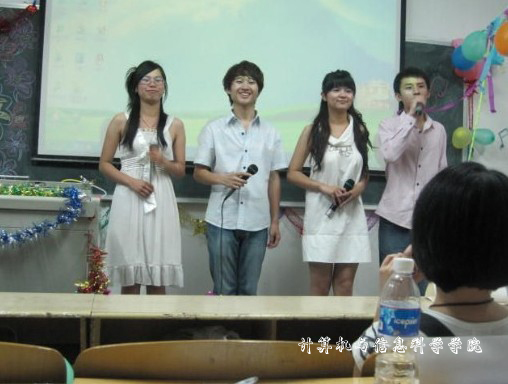 比赛现场,一首首悠扬的歌曲轮番上演,形成一道道视听冲击波,使全场为之欢呼。《你的甜蜜》展现出年轻的我们张扬的个性;《同桌的你》弹奏出我们深深的眷念;《一千零一个愿望》演绎着我们的执着与信念……台上选手尽情地展示自我,台下的观众也“毫不示弱”,掌声、呐喊声不断,现场气氛轻松而活跃。班委们更以一曲《爱因为在心中》再次将现场气氛推向了高潮。最后,比赛在《相亲相爱》的歌声中完美落幕。