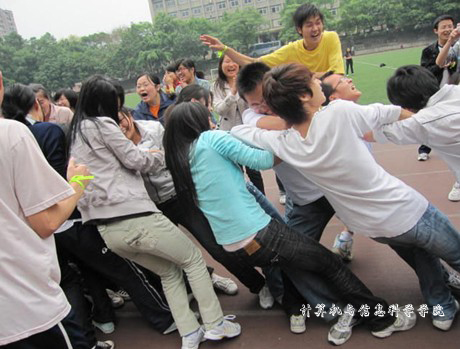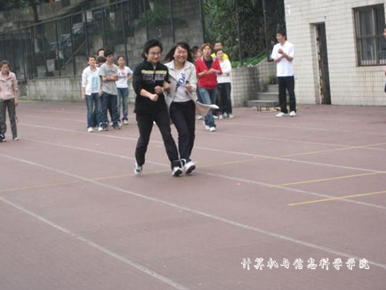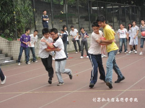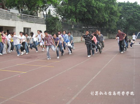 学生会体育部组织的趣味运动会在老校区足球场举行。本次比赛共设置了纸衣往返跑、两人三足和迎面接力等六个项目,08、09级电子商务班全体同学参加了此次比赛。