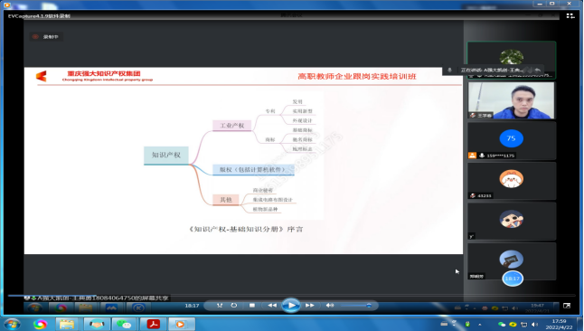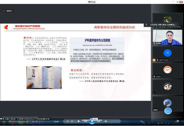 在本次讲座中,叶青老师为我们邀请到重庆强大凯创专利代理事务所(普通合伙)IP咨询师王典勇以及王学春导师来为同学们答疑解惑,分享经验。讲座上,王典勇老师就知识产权概念、性质、软著申请流程、注意事项以及不同类型专利的保护期限、审查周期、审查阶段等方面给同学们进行了详细的阐述。对于参加比赛的同学们来说,王学春导师则从大学生参加竞赛的角度强调,知识产权就像是一条“护城河”,牢牢的保护着大家的权益。同时,他还指出在相关竞赛中,知识产权清单的完整性、专业性撰写与提供对项目的论证很重要。