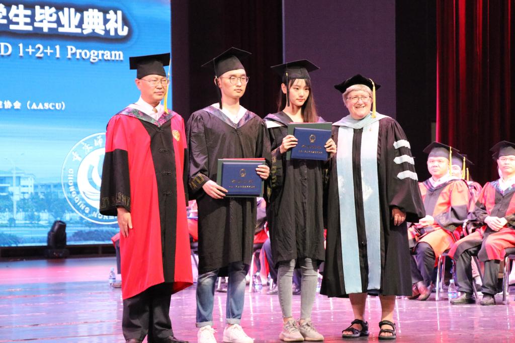 概况,近年来的发展战略、成就与在中美121项目上取得的成果,以及对各位毕业生寄予的殷切希望。中美双方各大学领导人向第十六届毕业生颁发毕业学位证书。美国北亚利桑那大学国际事务副校长林言成,中教国际教育交流中心121项目总监王颖博士主持了仪式。接下来,中教国际教育交流中心印凯主任宣布了关于表彰《中美人才培养计划》121项目2019年度优秀毕业生的决定。随后,印凯主任和美国特洛伊大学杰克·霍金斯校长向中美121项目2019年度优秀毕业生代表颁奖。颁奖结束后,中美121项目第十六届毕业生代表,世界杯决赛