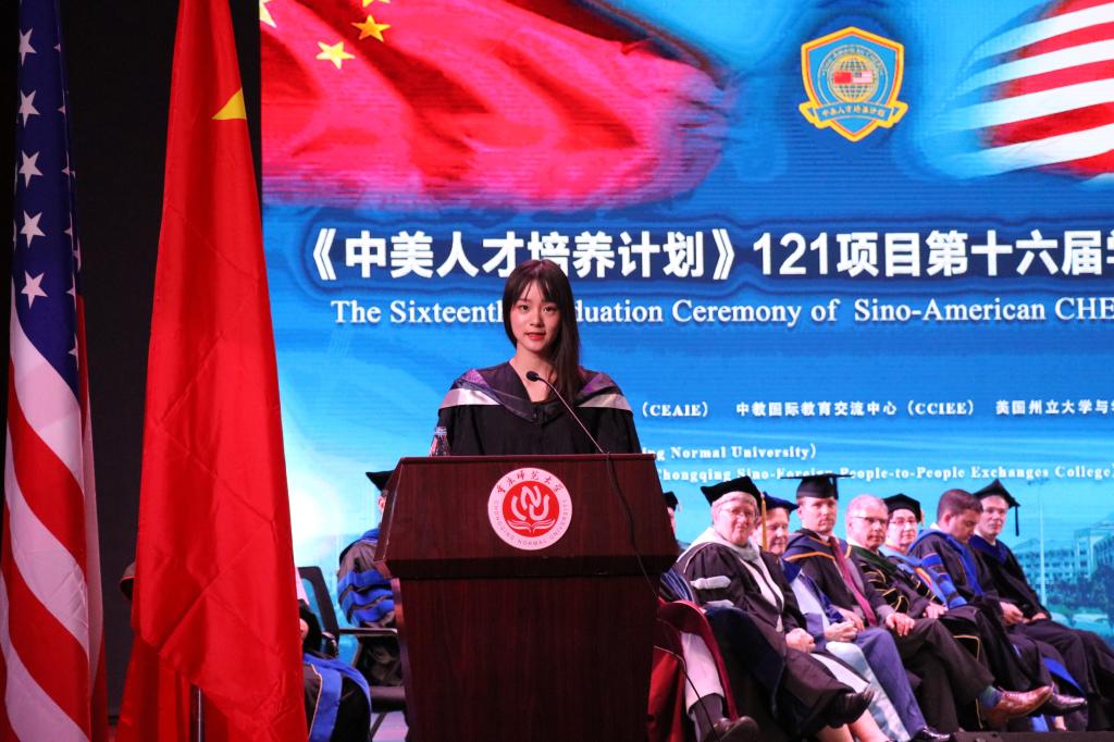 /鲍尔州立大学毕业生甘乙均同学上台讲述了自己在两年求学经历中的心路历程以及成长,表达了自己对于中美121项目的感激,并对此项目能帮助更多的学生成长表达了真心的祝愿。最后主持人陆校长为毕业生送上了诚挚的祝福,到此典礼结束。