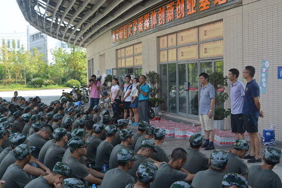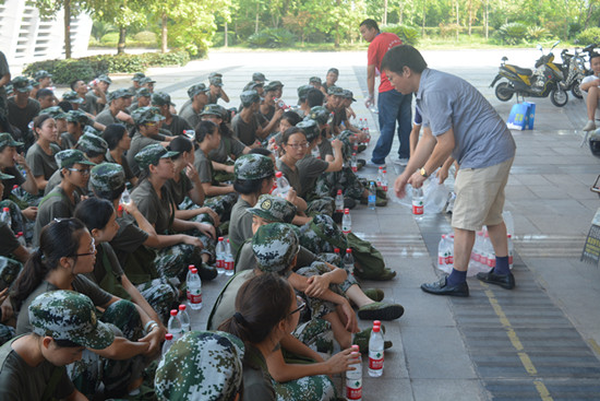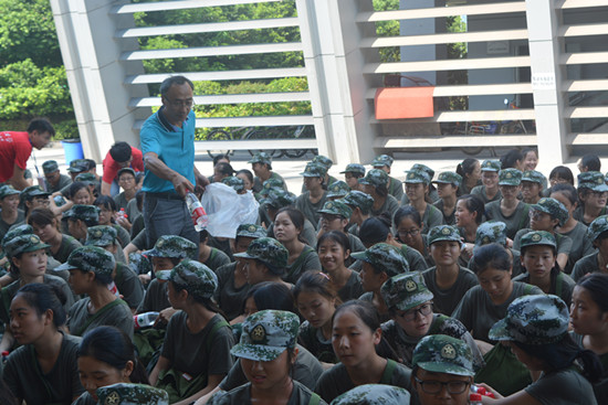 领导将矿泉水分发至每一位同学手中,鼓励同学们继续发扬吃苦耐劳的精神,确保军训实效。相信同学们在世界杯决赛
